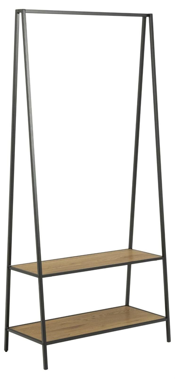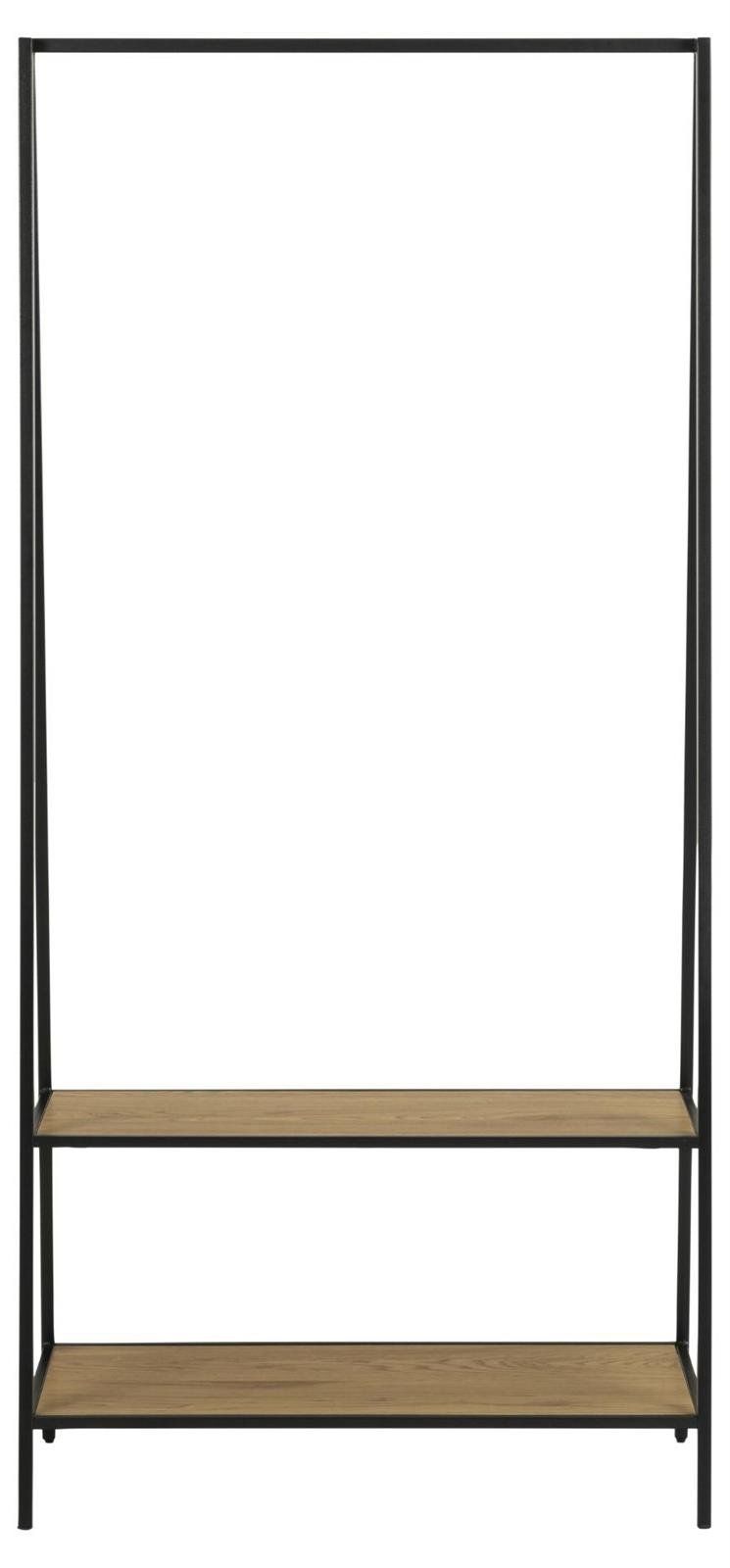 Использование прочных материалов. Вешалка Seaford имеет металлический каркас с черным порошковым покрытием. В нижней его части расположены две широкие полки из плиты МДФ, покрытой ламинатом цвета дикого дуба. Полки можно успешно использовать для хранения обуви. В верхней части вешалки имеется металлическая трубка, расположенная крест-накрест, на которую можно вешать даже крупногабаритные предметы одежды, такие как куртки или длинные платья. Seaford имеет изящную, но стабильную конструкцию. Минималистская, промышленная мебель Вешалка Seaford имеет очень минималистский дизайн. Выглядит стильно и элегантно, отлично впишется в интерьер, оформленный в индустриальном и современном стиле. Вешалка будет хорошо смотреться в коридоре или зале ожидания. Изготовлена из металла и МДФ-плит. Стабильная конструкция. Идеально подходит для верхней одежды и обуви. Минималистичный дизайн. Впишется в индустриальные и современные интерьеры. Количество ящиков: 1. Размеры ящика: 175x46x8 см. Вес ящика: 9,8 кг.