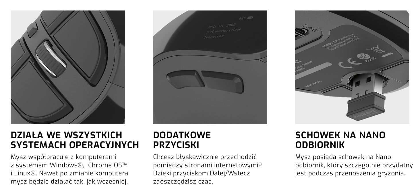 Natec Euphonie — это высококачественная конструкция, изготовленная только из специально отобранных материалов. Необработанный, сбалансированный дизайн, идеальная подгонка элементов и набор самых уникальных функций создают ощущение, будто мы используем продукт премиум-класса Natec Euphonie — мышь, которая будет радовать вас на высоком уровне долгие годы.