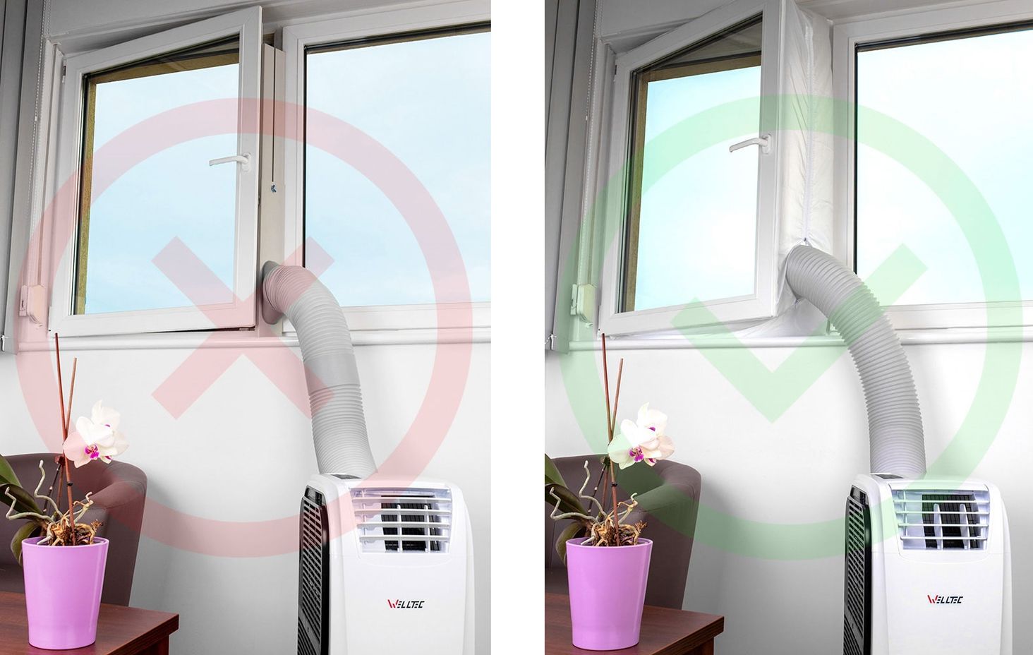 Чтобы повысить эффективность устройства, используйте оконный уплотнитель, как показано на втором фото. Установить оконный уплотнитель очень легко, а разница в эффективности охлаждения воздуха кондиционерами значительна. См. оконные уплотнители.