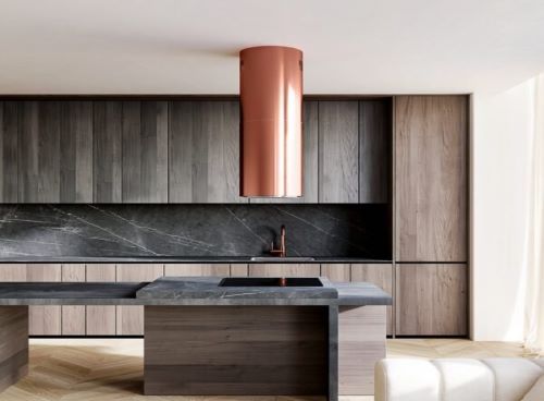 Данная вытяжка предназначена для установки над кухонным островом. Ее также можно использовать в качестве настенной вытяжки, прикрепив ее к потолку рядом со стеной. Для изготовления островной вытяжки Heweno Isola 39.1 Copper использовалась нержавеющая сталь.