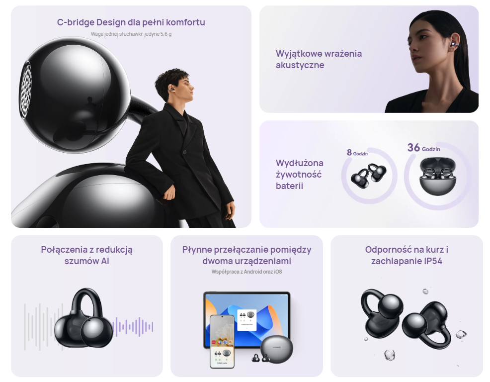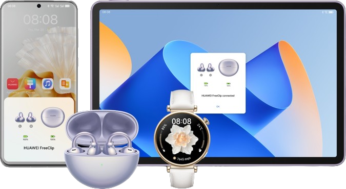Завдяки ергономічному дизайну, заснованому на аналізі форми понад 10 000 вушних раковин6, HUAWEI FreeClip гарантує комфорт і ідеально підходить для будь-якого розміру вуха.