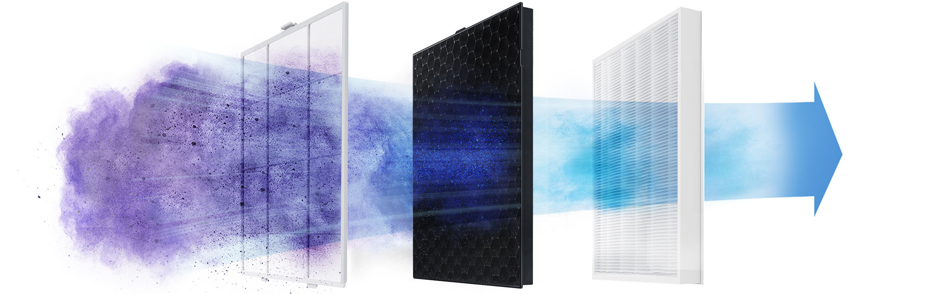 Попередній фільтр (зовнішній) вловлює більші частинки пилу, пилок і шерсть тварин. Дезодоруючий фільтр з активованим вугіллям видаляє шкідливі гази, чадний газ і дим*. А надзвичайно точна система фільтрації HEPA видаляє до 99,97% частинок пилу розміром 0,26 мкм (наприклад, кліщів і бактерій)**.