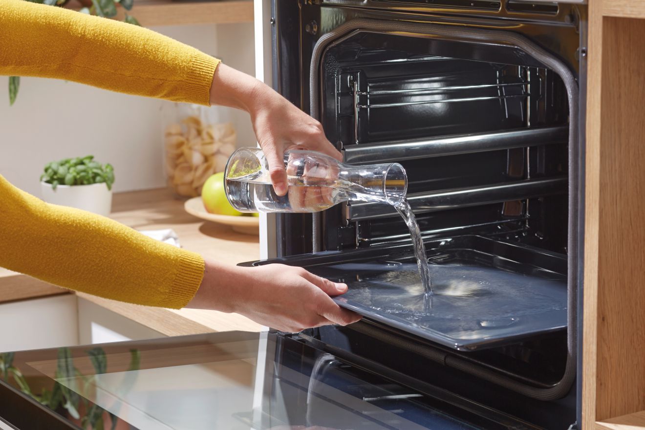 AquaClean чудово допомагає в очищенні духовки. Просто налийте півлітра води в деко і вмикайте AquaClean після кожного випікання. Вже через 30 хвилин результати видно на всій поверхні та на деках. Плями та жир пом’якшуються, і їх можна легко витерти.