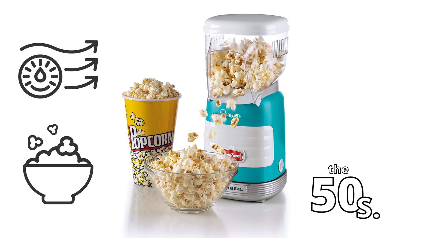 Використання спеціальної технології Hot Air дозволяє приготувати смачний, корисний і низькокалорійний попкорн без використання масла і жиру в Popcorn Popper від Ariete. Смажені таким чином кукурудзяні зерна будуть не тільки легкими та поживними, але, перш за все, багатими на вітаміни, клітковину, фосфор, калій, магній та численні антиоксиданти.