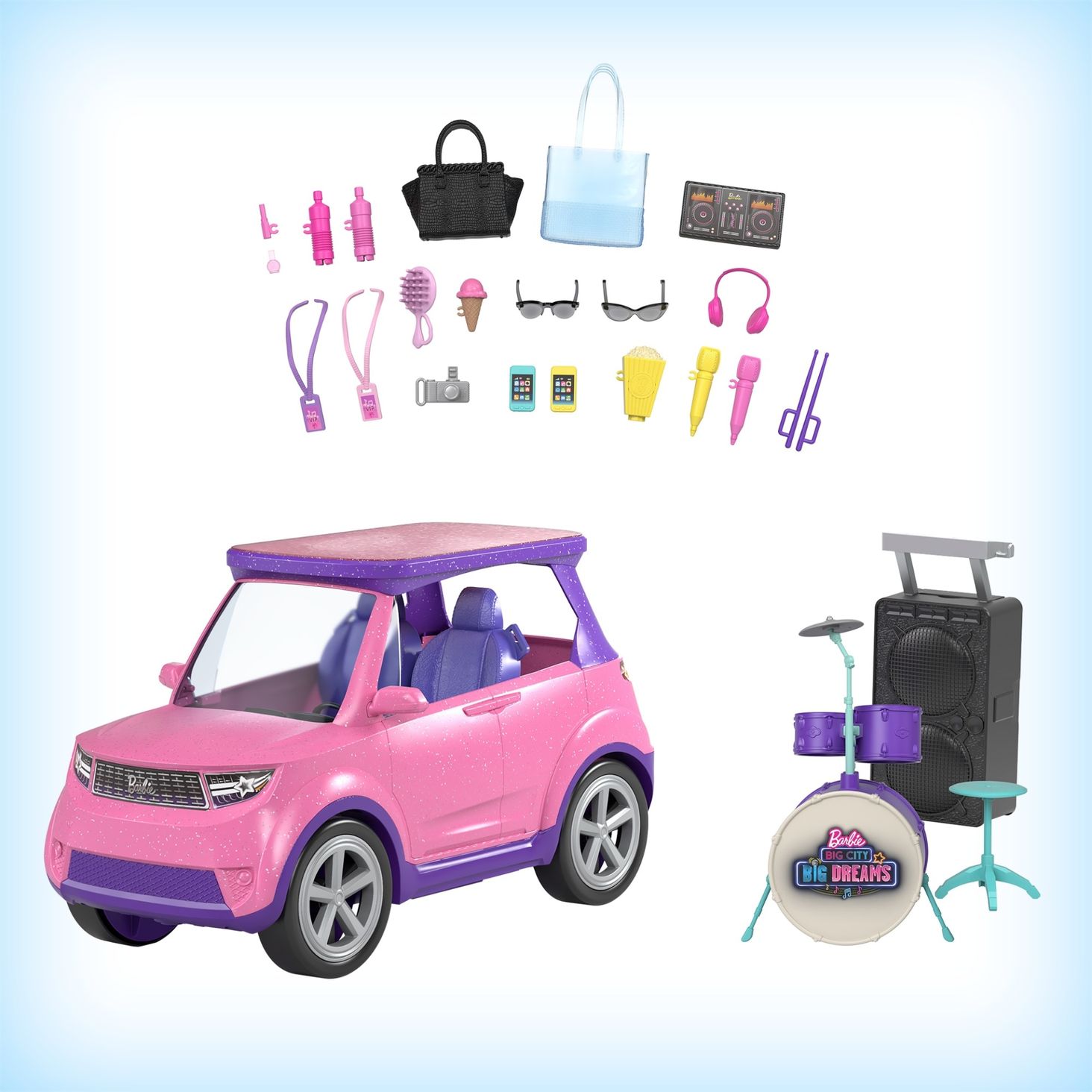 Блискучий рожевий автомобіль має знімний дах, який стає сценою, знімні сидіння (для глядачів) і понад 20 тематичних аксесуарів, зокрема динаміки, інструмент, мікрофони тощо.