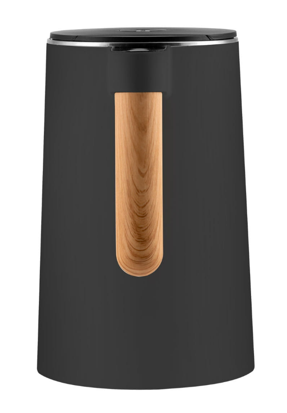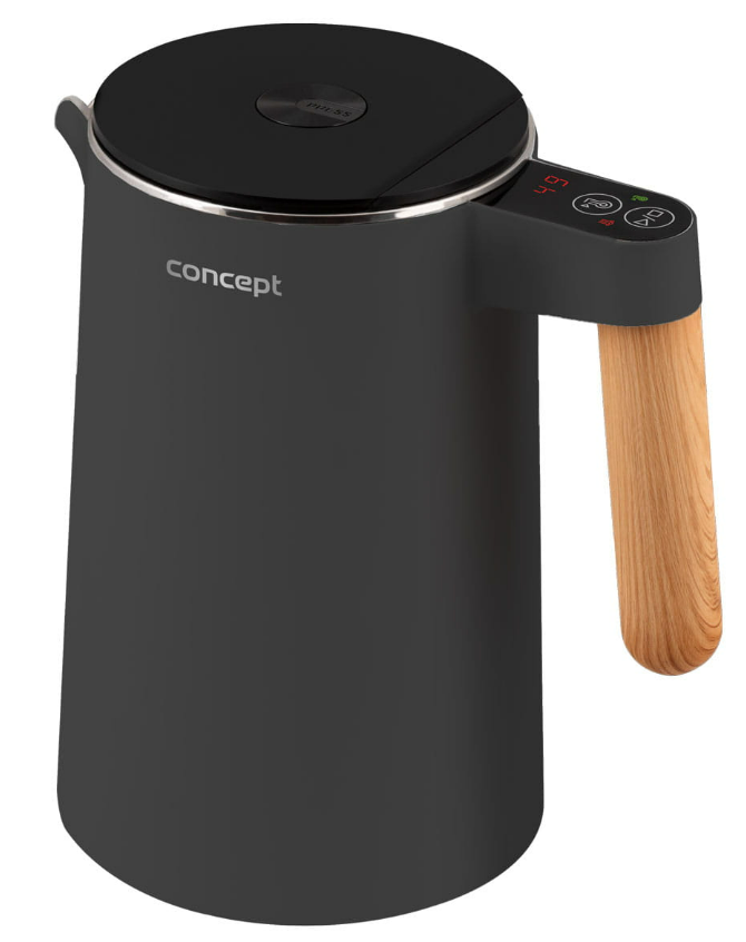 Чайник Concept RK3302 Salt-Pepper знайде місце в кожному домі. Його привабливий зовнішній вигляд підкреслює антрацитовий матовий корпус, встановлений на мінімалістичну основу, доповнений елегантною ручкою з імітації дерева. Завдяки ємності 1,5 л ви можете зручно приготувати до 6 чашок улюбленого гарячого напою