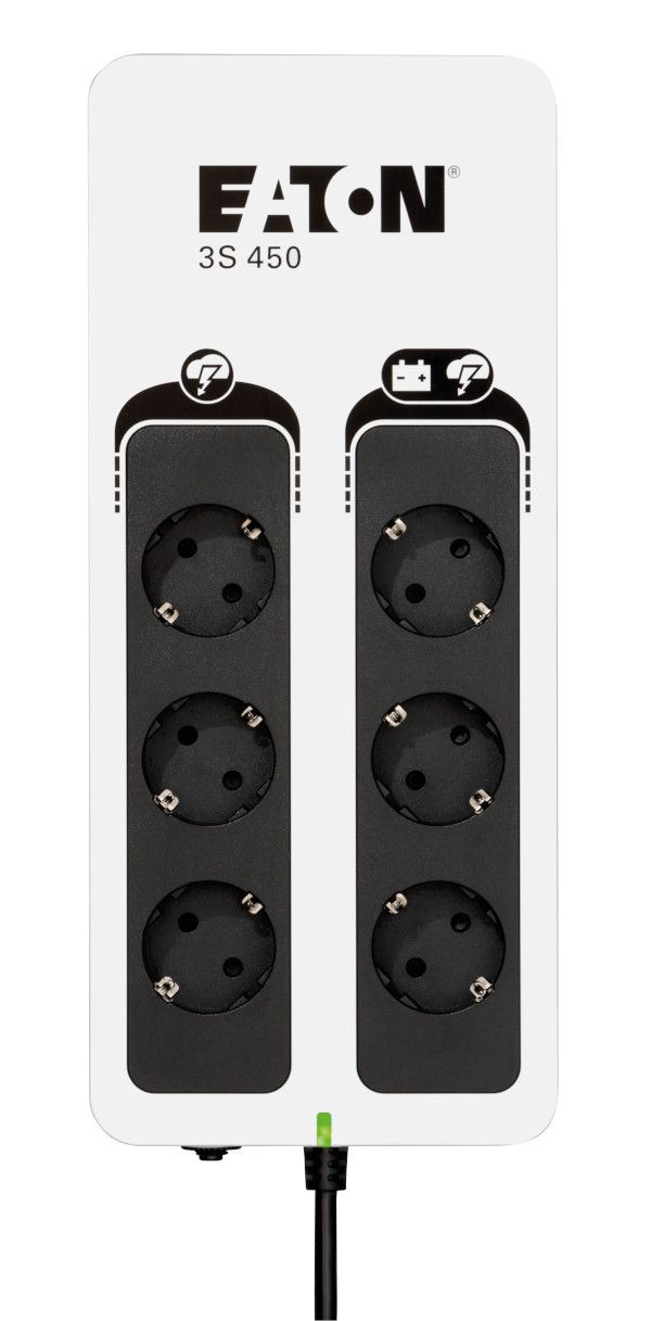 ДБЖ Eaton 3S450D призначений для домашніх користувачів і користувачів малого бізнесу. Елегантний зовнішній вигляд ідеально впишеться в сучасний простір квартир, будинків і офісів. Він забезпечує безперервну роботу пристроїв під час відключення електроенергії та вдосконалений захист від стрибків напруги, який запобігає пошкодженням через удари блискавки або випадкові стрибки напруги. Воно мовчить. Він забезпечує повну потужність 450 ВА, що перетворюється на 270 Вт активної потужності. Це забезпечує безпеку таких пристроїв, як телевізор, цифровий декодер, настільний комп’ютер, монітор, маршрутизатор, модем, касовий апарат та інші мережеві пристрої.