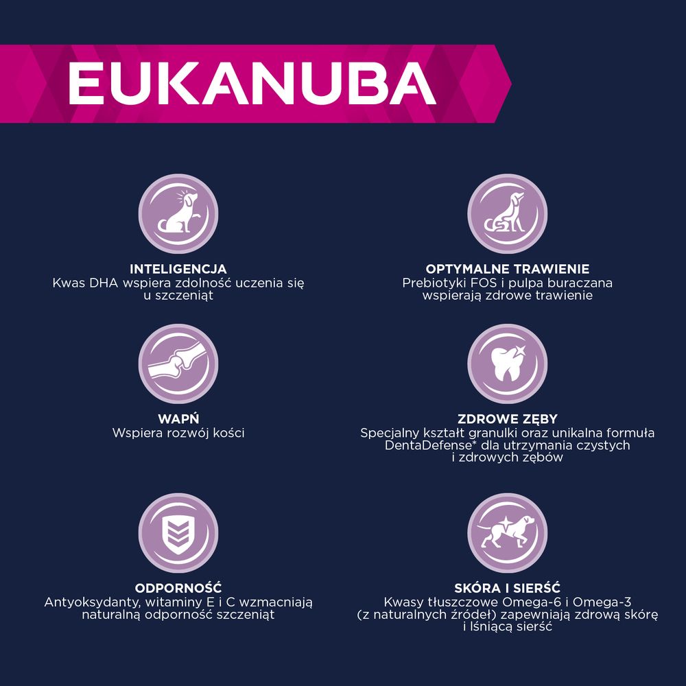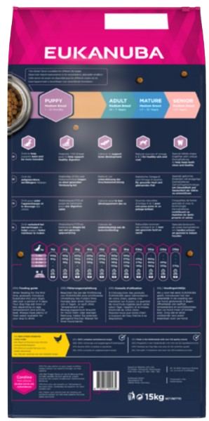 Сухий корм EUKANUBA багатий свіжою куркою і ідеально підходить для цуценят середніх порід віком від 1 до 12 місяців. Ретельно підібрані інгредієнти забезпечують харчування, адаптоване до потреб цуценя під час росту та розвитку. Корм містить кислоти DHA, які підтримують гостроту розуму та здатність до навчання цуценят, а також кальцій, який підтримує розвиток кісток. Спеціальна суміш клітковини, що складається з пребіотиків FOS, MOS і бурякового жому, підтримує здорове травлення. Корм також містить природні джерела жирних кислот Омега-6 і Омега-3, які забезпечують здорову шкіру і блискучу шерсть. Особлива шестикутна форма гранул і унікальна система DentaDefense допомагають зберегти Ваші зуби здоровими і чистими. Харчування 100% повноцінне та збалансоване. Покращена поживна дія для цуценят середніх порід забезпечує оптимальний стан і благополуччя протягом усього їхнього життя.