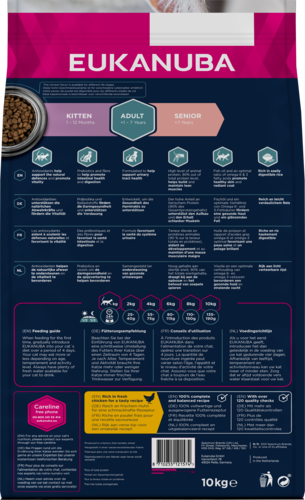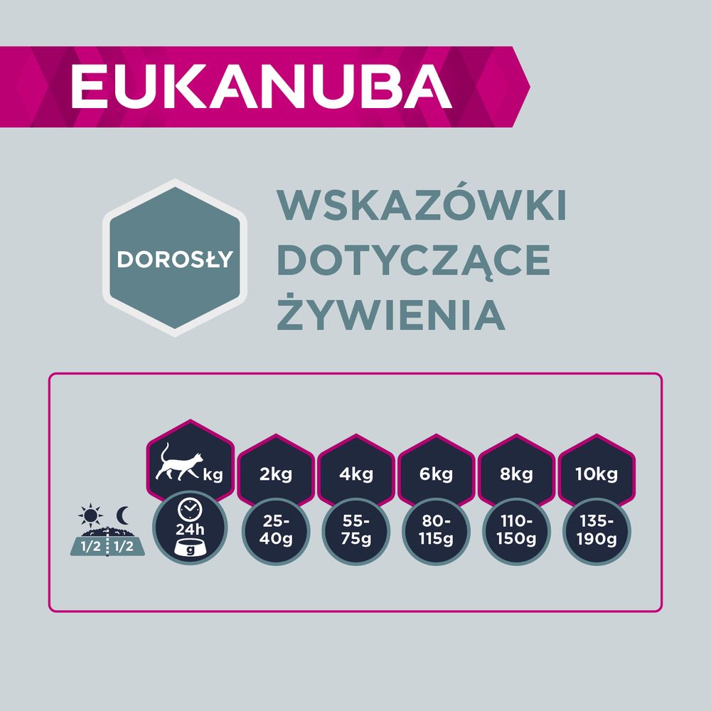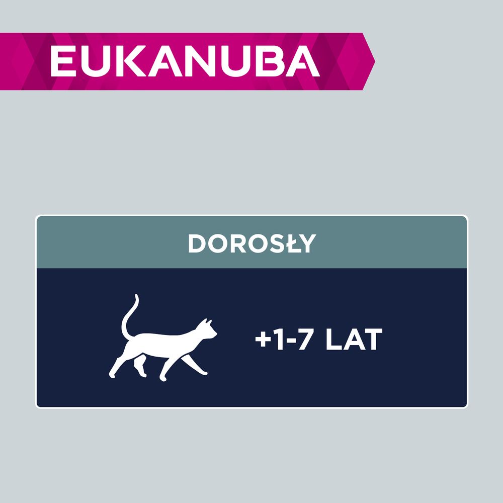 Після того, як вашій кішці виповниться рік, ви повинні розглянути можливість переходу на доросле харчування. У EUKANUBA ми віримо, що коти походять від м’ясоїдних тварин, тому дорослих котів слід правильно годувати. Тому ми пропонуємо корм для дорослих котів, який є на 100% повноцінним і збалансованим завдяки вмісту протеїну високої біологічної цінності. Білок забезпечує організм інгредієнтами (так звані амінокислоти), які необхідні для безперервного створення та оновлення тканин і для належного функціонування організму, включаючи боротьбу з інфекціями та регулювання гормонального балансу. Харчові продукти, які містять усі незамінні амінокислоти в пропорціях, необхідних для здорового росту, вважаються білками високої біологічної цінності. Ось чому всі корми EUKANUBA для котів містять тваринний білок.