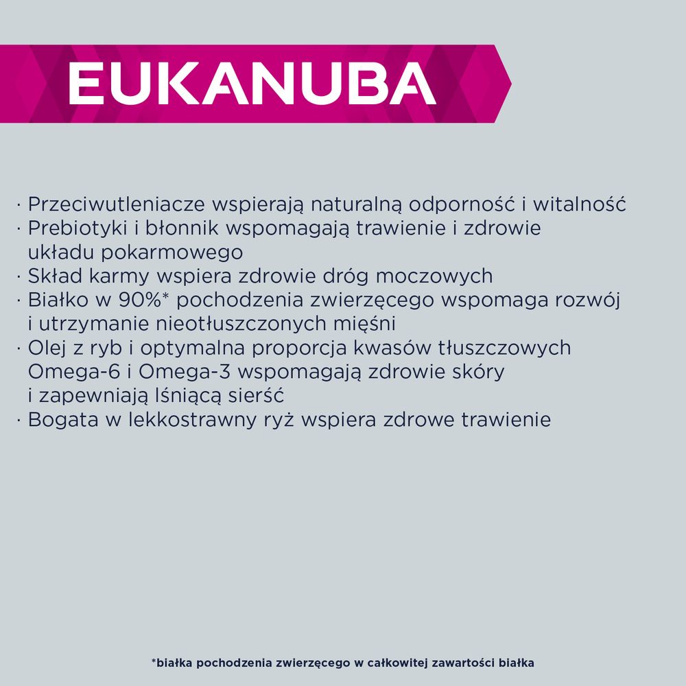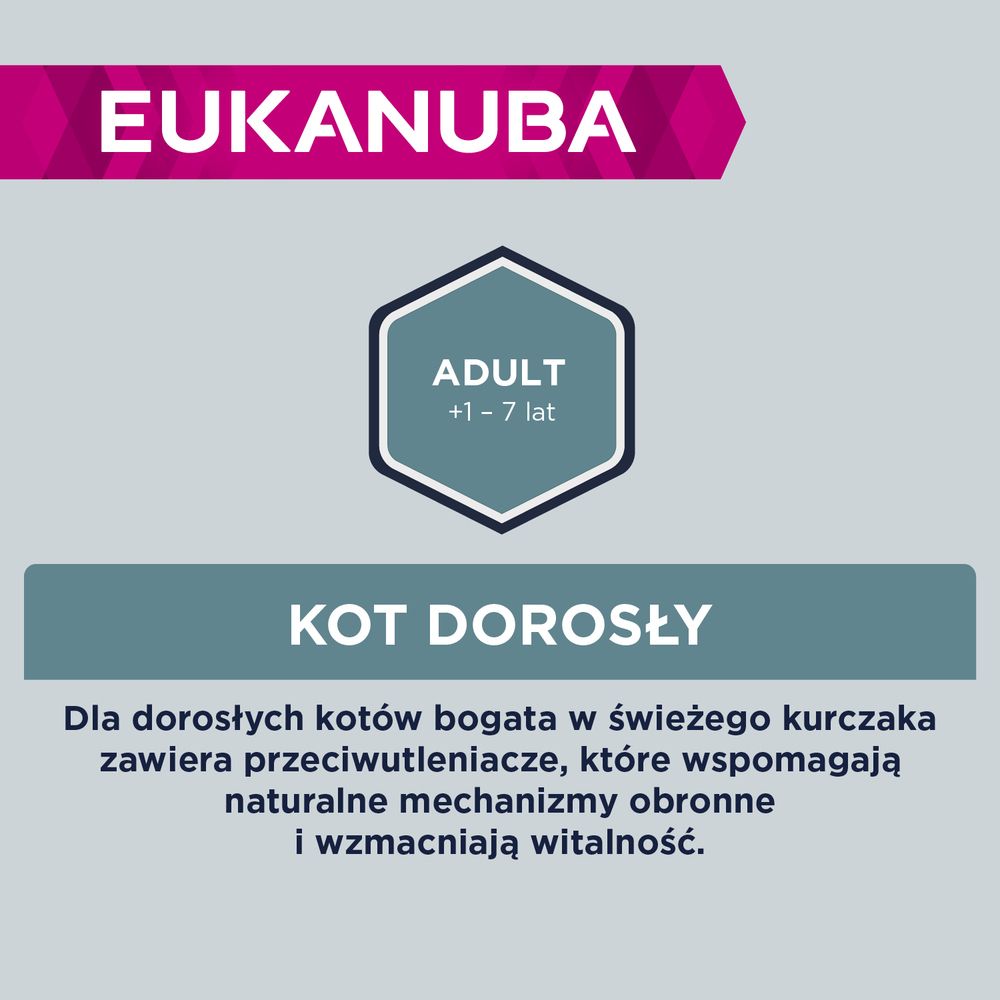 Сухий корм EUKANUBA ADULT для дорослих котів на 100% повноцінний і збалансований. До 90% білка в цій смачній їжі, багатій на свіже куряче м’ясо, тваринного походження, що сприяє розвитку та підтримці сухої мускулатури. Корм не містить пшениці*, але містить велику кількість легкозасвоюваного рису, а також пребіотиків і клітковини для підтримки травлення та здорового травлення. Крім того, ця спеціальна їжа підтримує здоров'я сечовивідних шляхів, а антиоксиданти зміцнюють природний захист і життєву силу. Риб'ячий жир і оптимальне співвідношення жирних кислот Омега-6 і Омега-3 підтримують здоров'я шкіри і забезпечують блиск хутра. Сухий корм EUKANUBA для дорослих котів смачний і не містить штучних ароматизаторів, барвників і ГМО.* Вироблено на заводі з переробки зерна.
