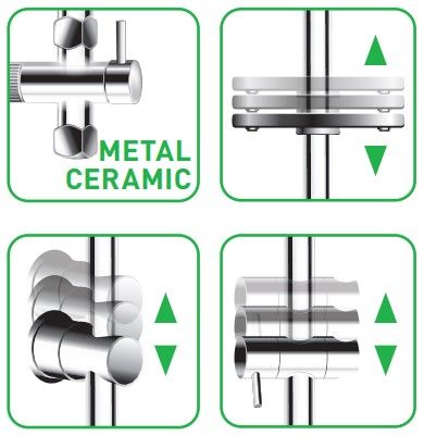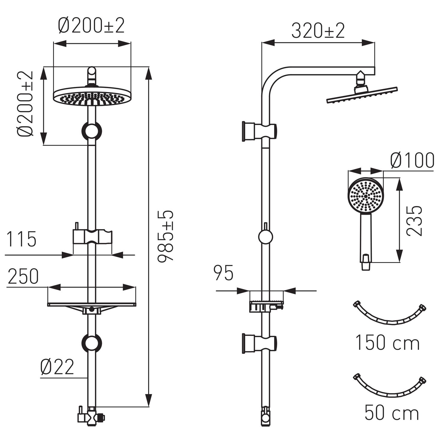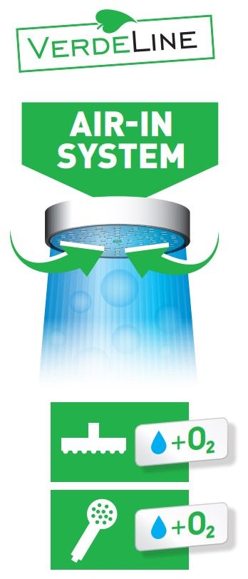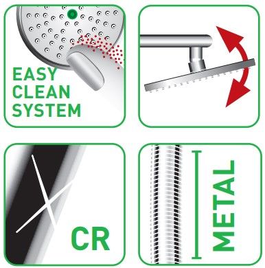 Основна інформація Металева дискова головка діаметром 200 мм Потік води в головці 5,5 л/хв - зменшення споживання води до 50% Ferro Air-in System - аерація водного потоку ковзаюча металева штанга 985 мм регульована відстань між ручками - можна встановити в наявні отвори діаметр ручки душ 100 мм, потік води ручки 6,4 л/хв - зменшення споживання води до 50%Ferro Air-in System - аерація потоку водикількість функцій душової ручки - 1FerroEasyClean - система для легкого видалення вапняного нальоту Душовий шланг 1500 мм з металевою опліткою З'єднувальний шланг 500 мм з гайкою 1/2" - універсальне з'єднання до кожного змішувача для ванни та душу металевий душовий перемикач зі вставкою кераміка, практична плоска полиця для косметики з регульованим кріпленням, хром