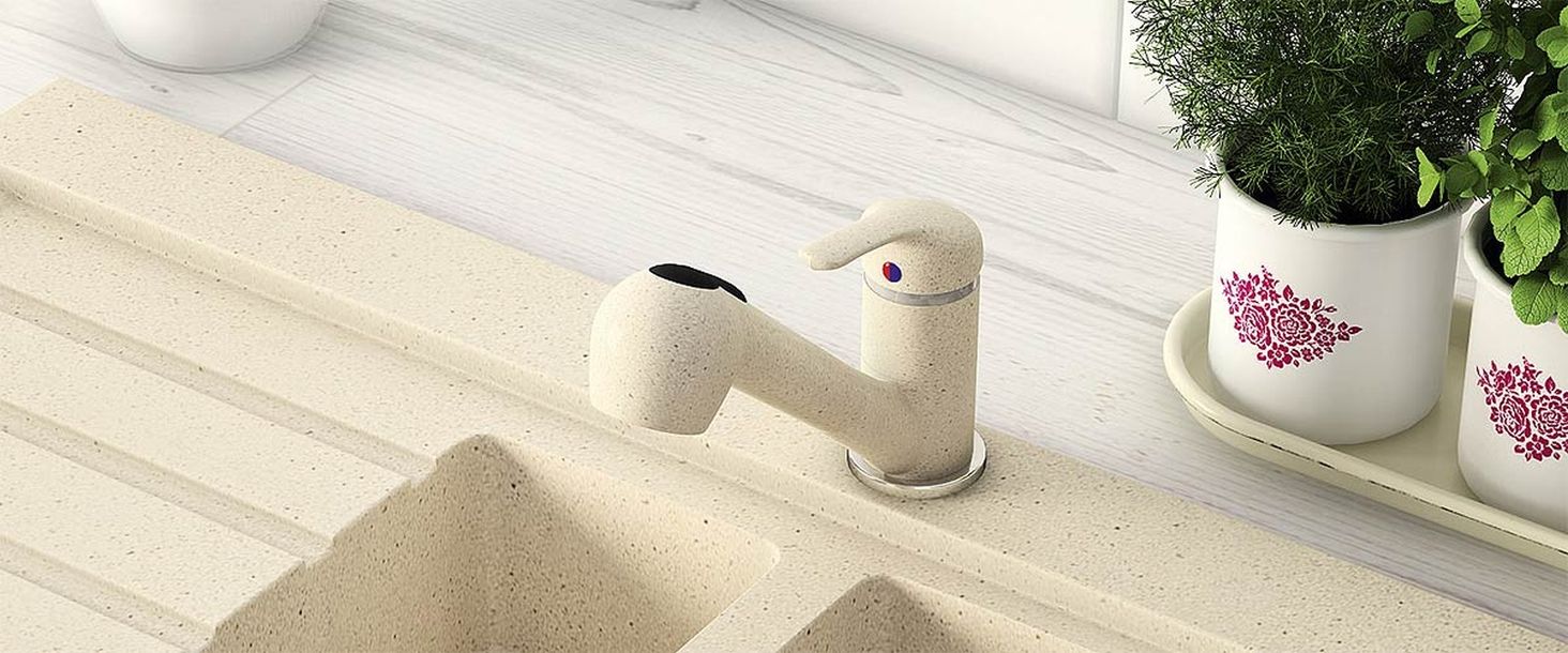 Пісочний гранітГранітна поверхня пісочного кольору зігріє кухонне облаштування. Змішувач з такою поверхнею стане ідеальною парою до гранітної мийки такого ж відтінку