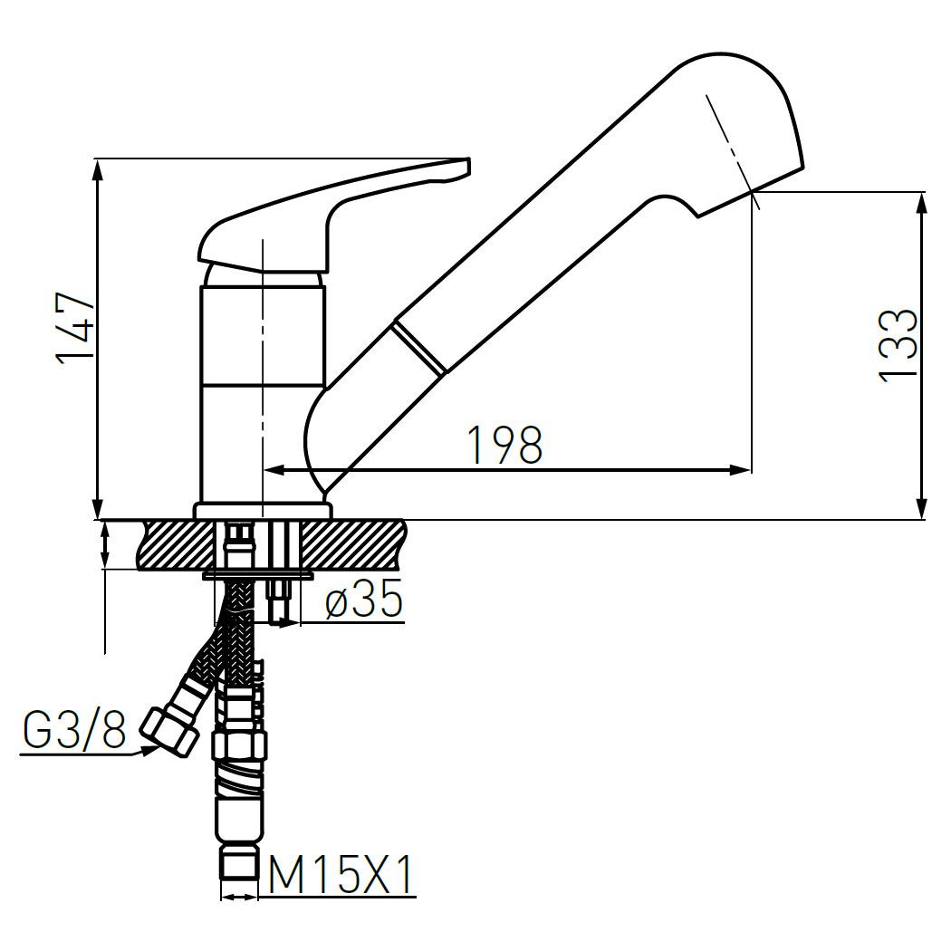 Основна інформація: поворотний вилив з висувною душовою ручкою, керамічний регулятор, установка на один отвір, регулятор струменя M22x1, автоматичний перемикач душ/потік, гнучкі з'єднання G3/8 - M10x1 графіт