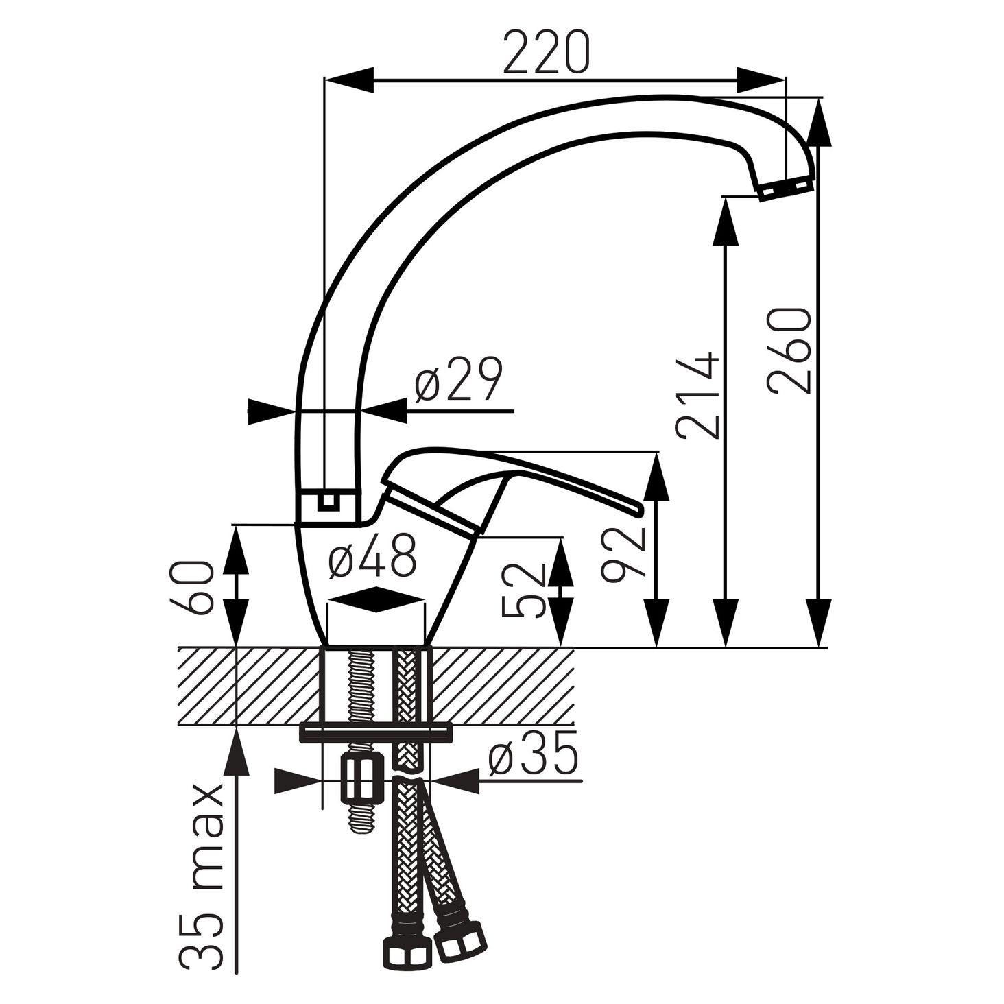 Основна інформація: керамічний регулятор, установка на один отвір, регулятор струменя M24x1, поворотний вилив, гнучкі з'єднання G3/8 - M10x1хром