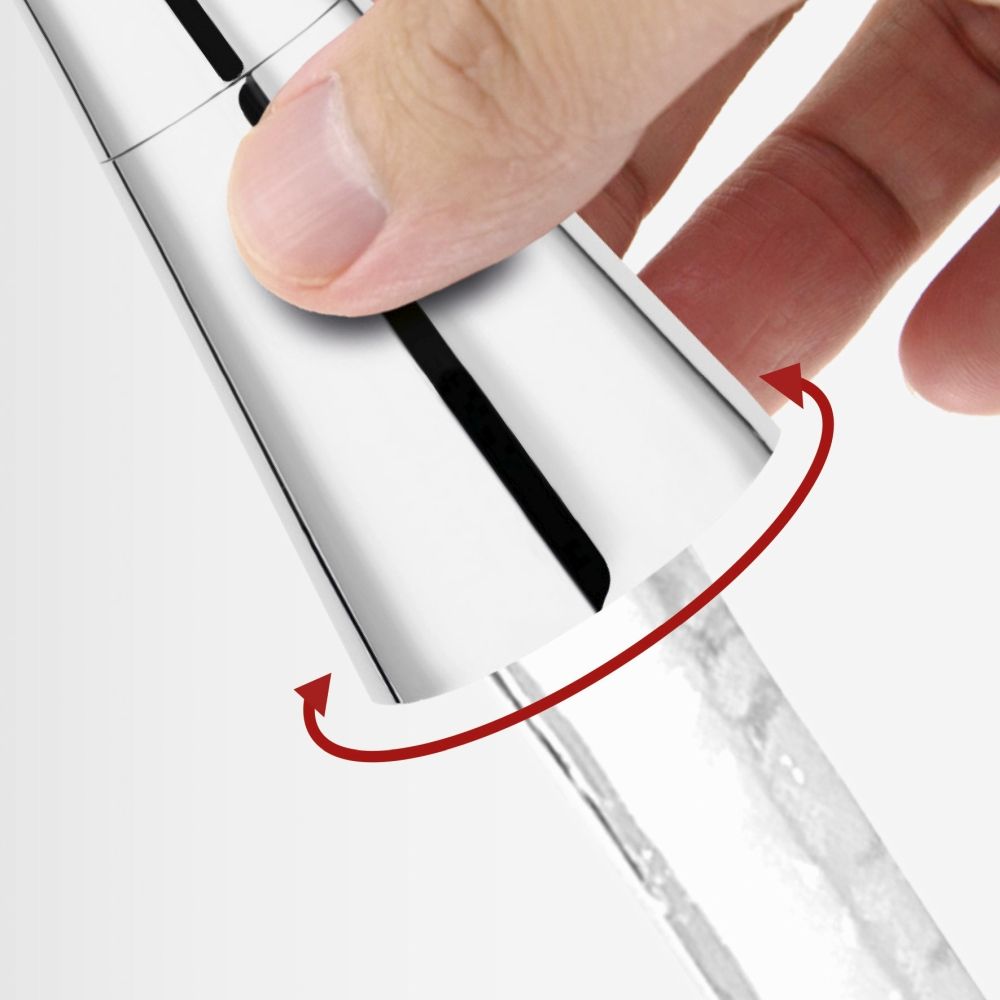 Дві функції потоку Перемикач, розташований на кінчику носика, дозволяє легко змінювати струмінь. ZUMBA II має два види. Аерований струмінь - рівномірний, пологий струмінь із середньою частиною кінчика. Використовується для наповнення посудин. Душ - струмінь, що розсіюється через форсунки по периметру виливу. Практичний для ручного миття та миття фруктів та овочів. ZUMBA II оснащений перемикачем потоку з двома функціями: аерований потік і душ. Струмінь змінюється поворотом носика.