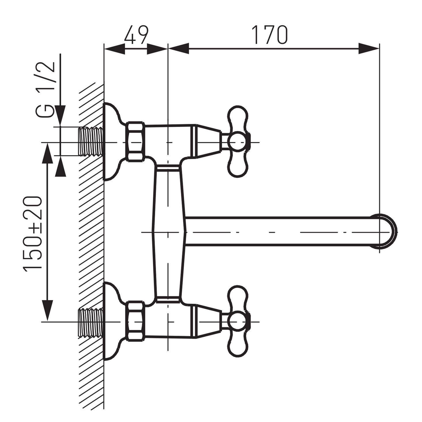 Основна інформація: керамічні головки, настінний монтаж, регулятор струменя M24x1, ексцентричне з’єднання G1⁄2, відстань 150 ± 20 мм, поворотний вилив L = 160 мм, хром