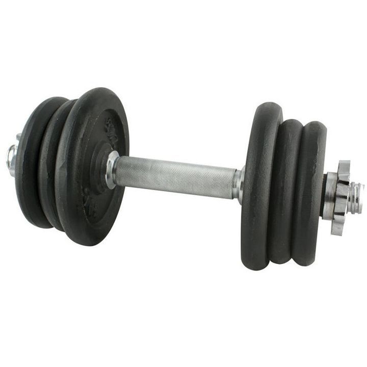 Низьова штанга з зіркоподібним затискачем, виготовлена з нікельованої сталі. IN набір чавунних плит вагою від 0,5 кг до 2,25 кг. Гантель рифлена ручка, тому вона не зісковзує під час занять. Гарантія на хомути рівномірний тиск тягарців.
