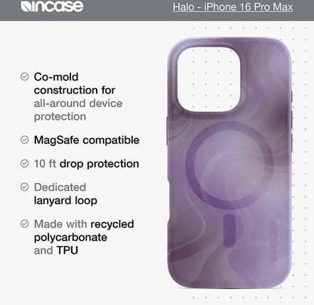 Incase Halo Case MagSafe створено за допомогою унікальної техніки занурення у воду, яка створює тонкі, аморфні градієнти кольорів, що нагадують природні візерунки та переходи кольорів. В результаті кожен корпус має свій унікальний, органічний вигляд, що відображає гармонію між сучасністю та естетикою, натхненною природою. Виготовлений із переробленого полікарбонату та ТПУ, чохол поєднує в собі легку конструкцію з винятковою міцністю, забезпечуючи повний доступ до всіх портів і кнопок. Він має м’яке на дотик покриття, стійке до зміни кольору.