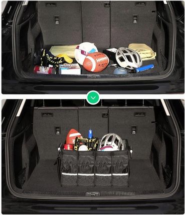 Дизайн обладнання органайзера Органайзер для автомобільного багажника можна розділити на два відділення за допомогою мобільної перегородки. Продумана конструкція дозволяє легко організувати інтер'єр в залежності від ваших потреб. Крім того, він оснащений зовнішньою сумкою, що застібається на липучку, в якій можна безпечно зберігати цінні речі та оптимально захистити їх від втрати чи крадіжки.