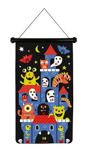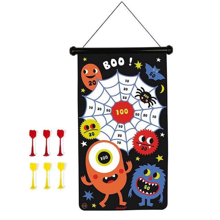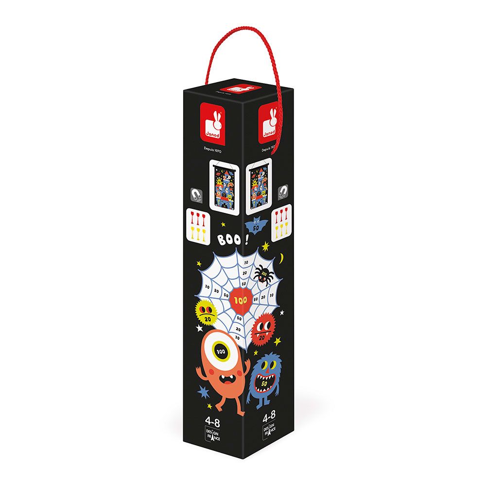 Магнітний дартс Monsters від французького бренду JANOD - це чудова розвага для двох – і дітей, і їхніх батьків. Набір складається зі згорнутої дошки для дротиків із шнурком для підвішування, наприклад, на стіну, і 6 магнітних дротиків двох кольорів (3 червоних і 3 жовтих). Чорна тканина щита проілюстрована з обох боків фігурами різнокольорових монстрів, павутини та замку з привидами. Дротики повинні бути спрямовані в ціль з відповідної відстані, визначеної гравцями, таким чином, щоб потрапити в залікові точки, позначені на мішені. Мета гри - зібрати якомога більше очок за три кидки. Виграє гравець, якому це вдасться. Ця гра розвиває концентрацію та спритність.
