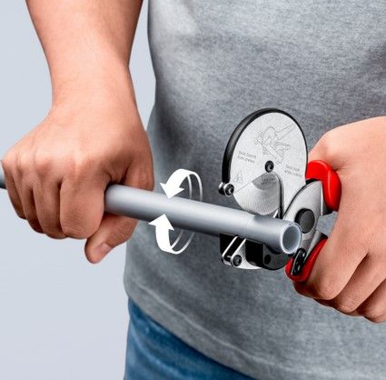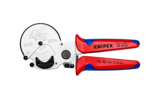 Опис: - До 60% менше зусилля: ріжучий диск, що вільно обертається, дозволяє трубі обертатися під час різання з мінімальним тертям - Оптимальний ефект різання: обертальний рух дозволяє ріжучому диску без проблем занурюватися, одночасно зменшуючи деформацію труби - Широкі шайби з пластиком дозволяють різати під прямим кутом - Легше різати алюмінієві композитні труби та пластикові труби, ніж з традиційні ножиці з фіксованим лезом - Також призначені для композитних труб з більш товстим алюмінієвим шаром (наприклад, Geberit Mepla) - Для різання композитних і пластикових труб з максимальним діаметром Ø 26 мм - Дозволяє дуже короткі коригувальні надрізи - Із запобіжним замком під час транспортування - Ергономічні багатокомпонентні ручки - Доступний запасний відрізний диск (арт. 90 25 25 E01) - хромованадієва електросталь спеціального сорту, загартована в маслі