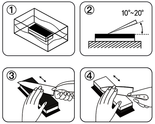 Як заточити ніж каменем? Попереднє заточування (шліфування): камінь 1000 грит_x000D_ _x000D_ Оздоблення (полірування): зернистість каменю 6000_x000D_ 1. Перед використанням замочіть точильний камінь у воді на 5 хвилин, щоб повністю ввібрати воду2. Міцно покладіть ніж на камінь і відполіруйте його відповідно до кута леза. Ви можете відполірувати свій ніж, перетягуючи лезо вгору та вниз по каменю._x000D_ 3. Спочатку використовуйте грубий камінь зернистістю 1000, щоб попередньо відшліфувати край леза._x000D_ 4. Потім, щоб отримати додаткову гостроту, використовуйте камінь із зернистістю 6000, поліруючи 5-20 хвилин, залежно від типу сталі.