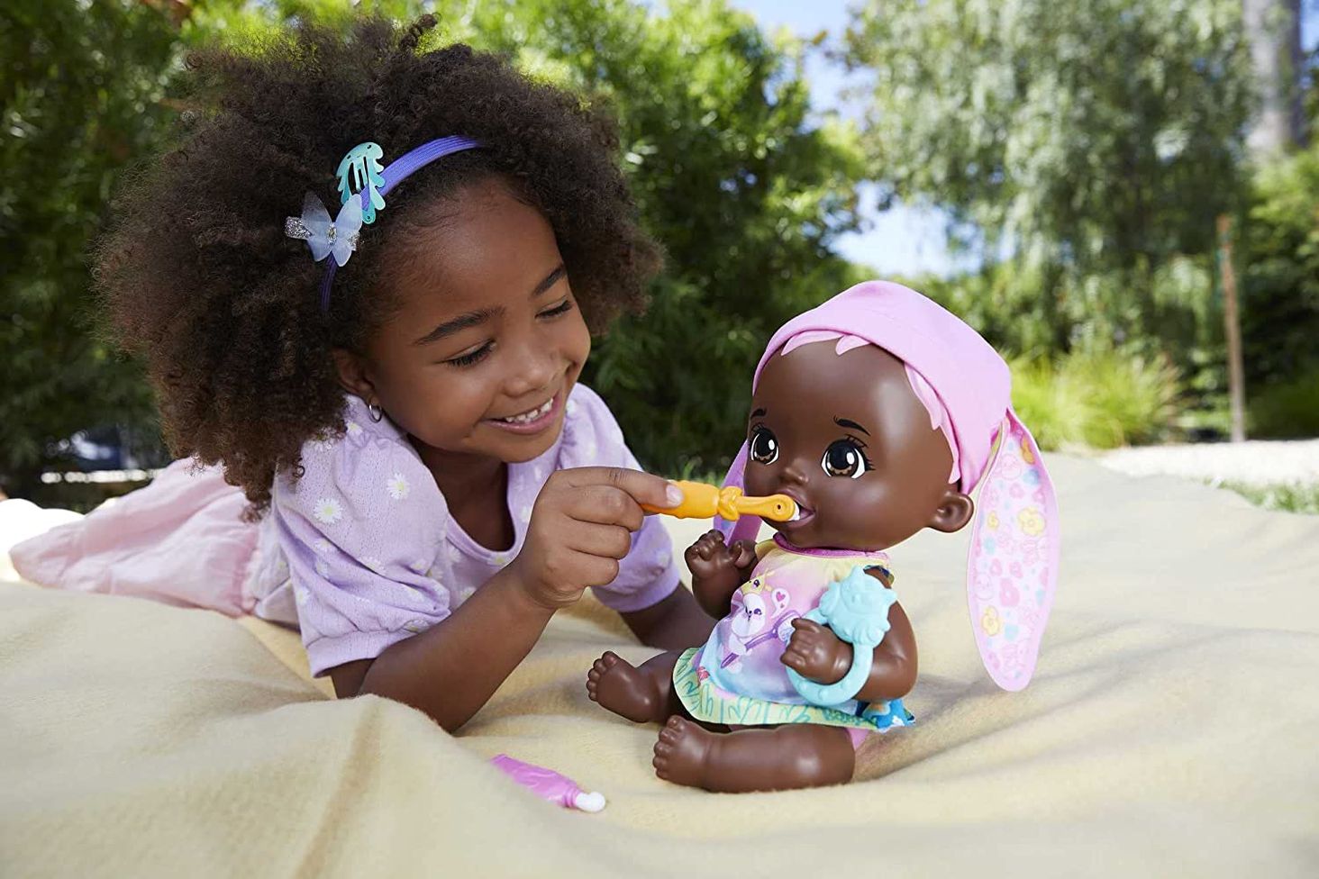 М'яка шапочка з вушками, милі деталі та солодкий аромат квітів перетворюють догляд за цим малюком у задоволення. Коли дитина чистить малюкові зуби зубною щіткою, голова ляльки повертається набік. Дитина, одягнена в костюм 2-в-1 (сукня і нічна сорочка), готова до цілого дня, повного веселощів, а потім солодкого сну.
