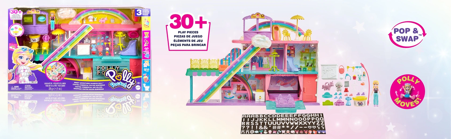 | Встановити елементи | zestaw do zabawy Polly Pocket™ Tęczowe centrum handlowe i ponad 35 akcesoriów, w tym lalka Polly™ (7,5 cm). |