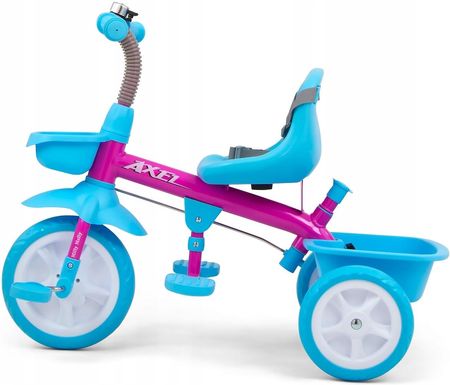 Сидіння на велосипеді регулюється по відстані від керма, що дозволяє підлаштувати велосипед під зріст дитини. Поєднання металевої конструкції та елементів, виготовлених з матеріалів найвищої якості, гарантує довговічність, яка працюватиме в будь-яких умовах. Однак широкі та міцні колеса з піни EVA забезпечують довговічність та тривале використання. Велосипед AXEL має знімну ручку для батьків і кошик для іграшок.