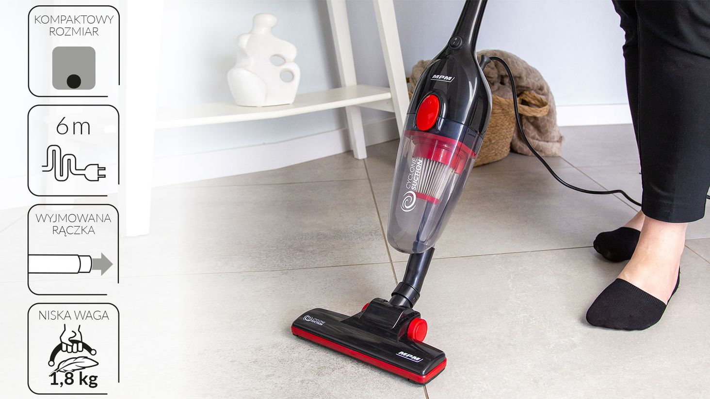 Відтепер прибирання будинку буде не «тягарем», а задоволенням. Компактні розміри і невелика вага - всього 1,8 кг MOD-39 гарантують зручне і комфортне прибирання. Невеликі розміри обладнання дозволяють легко маневрувати під час роботи і зручно зберігати - при знятій ручці пристрій займає мало місця. Модель оснащена шнуром живлення довжиною 6 м, що означає, що ви можете легко пилососити навіть великі поверхні.