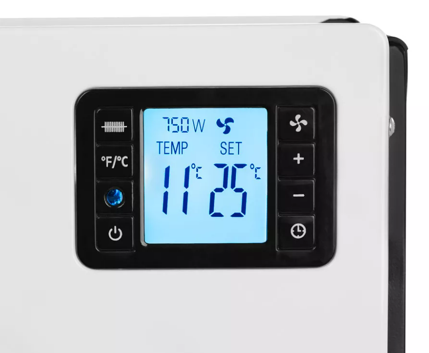 Пристрій оснащений РК-дисплеєм, на якому відображається поточна і запрограмована температура в приміщенні, потужність нагріву і час автоматичного програматора. Час роботи тепловентилятора дозволяє встановити час роботи. Завдяки цьому пристрій автоматично вимкнеться у вказаний час.