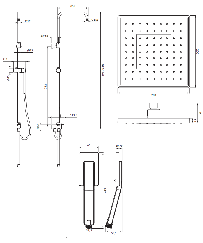 ТЕХНІЧНІ ХАРАКТЕРИСТИКИ для монтажу з будь-яким накладним змішувачем для душу або ванни, душова колонка з перемикачем і кронштейном для монтажу тропічного душу, відстань між монтажними кронштейнами: 73,2 см, тропічний душ, розмір: 20х20 см, на відстані руки від стіна: ~41 см, ручний душ, 3 функції, тип струменя: дощ, хлист, змішаний душовий шланг з ПВХ оболонкою, довжина: 150 см з’єднувальний шланг для душового змішувача висота поворотного плеча: 87,2-114,2 см (регулюється) Колір: хром