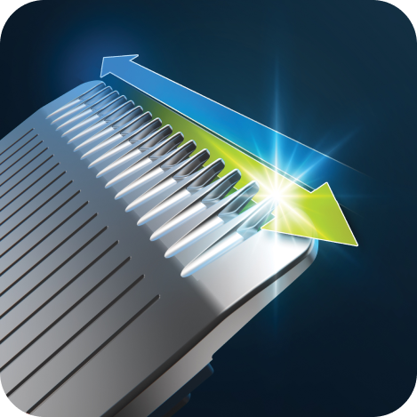 Під час гоління подвійні леза з нержавіючої сталі труться одне об одне. Завдяки цьому їх гострота і ефективність не знижуються навіть після багаторазового використання. Це дає змогу точно очистити кожен елемент вашої бороди та точно завершити найдрібніші деталі.