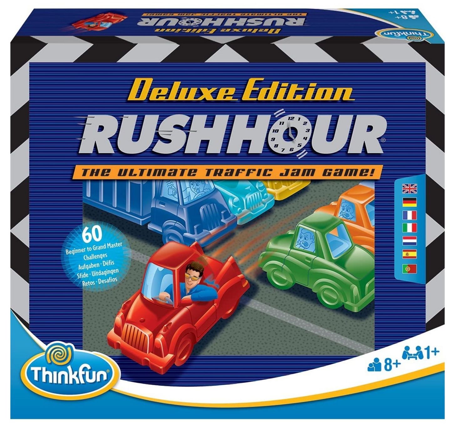 Rush Hour Deluxe — це класика серед ігор-головоломок — цього разу в новому пакеті. Це гра, яка розвиває вміння послідовно мислити. Гра полягає в тому, що на дошці розставляються різнокольорові пластикові машинки у конфігурації з однієї з 60 карток із завданнями, а потім рухаються лише по вертикалі та горизонталі – дістають червону машину із затору. Картки, що входять до набору, містять 5 рівнів складності. У Rush Hour Deluxe можна грати поодинці (просто відпрацьовуючи послідовності) або з іншими гравцями. Вміст: ігрова дошка, 4 блокувальні вантажівки, 11 блокуючих машин, червона машина (основна машина), 60 карток із завданнями, інструкції та рішення.< /p >