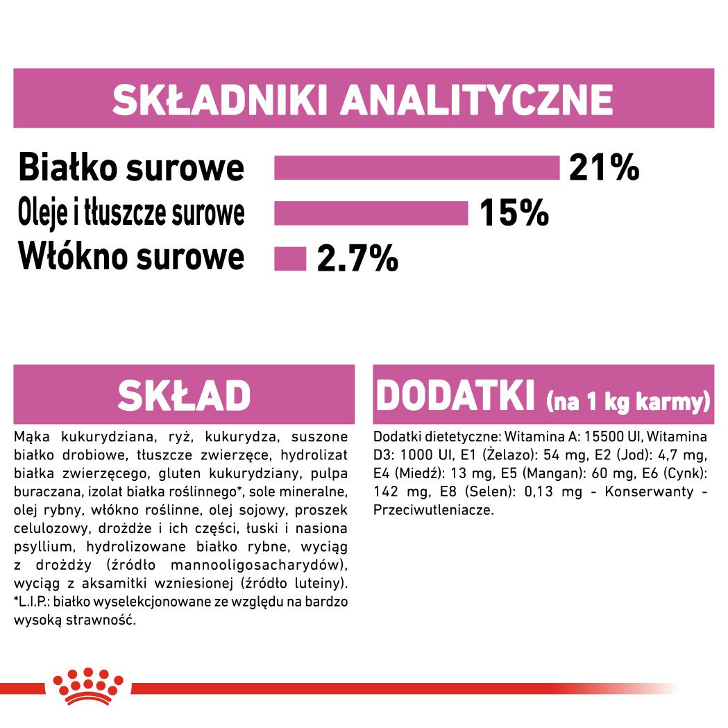 Усі корми Royal Canin повноцінні, а це означає, що вони на 100% покривають потребу організму у високоякісних білках, жирах, клітковині, вітамінах і мінералах, необхідних для здоров’я та гарного самопочуття вашої собаки.