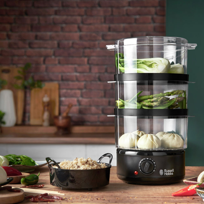 Якщо ви думаєте, що здорове харчування — це лише салати, сирі овочі та листя салату, подумайте ще раз. Компактна пароварка Russell Hobbs приносить смачні страви на стіл, використовуючи силу пари. Приготування на пару допомагає зберегти більше антиоксидантів, які містяться у свіжих овочах (таких як брокколі, зелена квасоля та шпинат), на 85%, тому це чудовий спосіб швидко та легко приготувати різноманітні смачні та поживні страви. Він має три окремі кошики для варіння на пару для різних інгредієнтів, резервуар на 500 мл (максимальне заповнення) і 60-хвилинний таймер, тому все, що вам потрібно зробити, це запрограмувати його та зайнятися іншими справами.