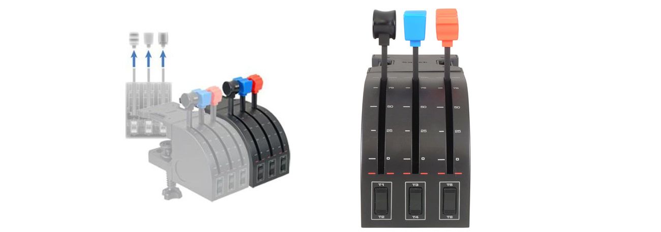Змінні наконечники важелів дозволяють будь-яку конфігурацію зовнішнього вигляду контролера, а розширений інтерфейс дозволяє підключати до 3 однакових модулів квадранта дросельної заслінки. Розширте функціональність своєї кабіни, запрограмувавши важелі на будь-яку функцію – керуйте паливною сумішшю, положеннями закрилків і кутами атаки.