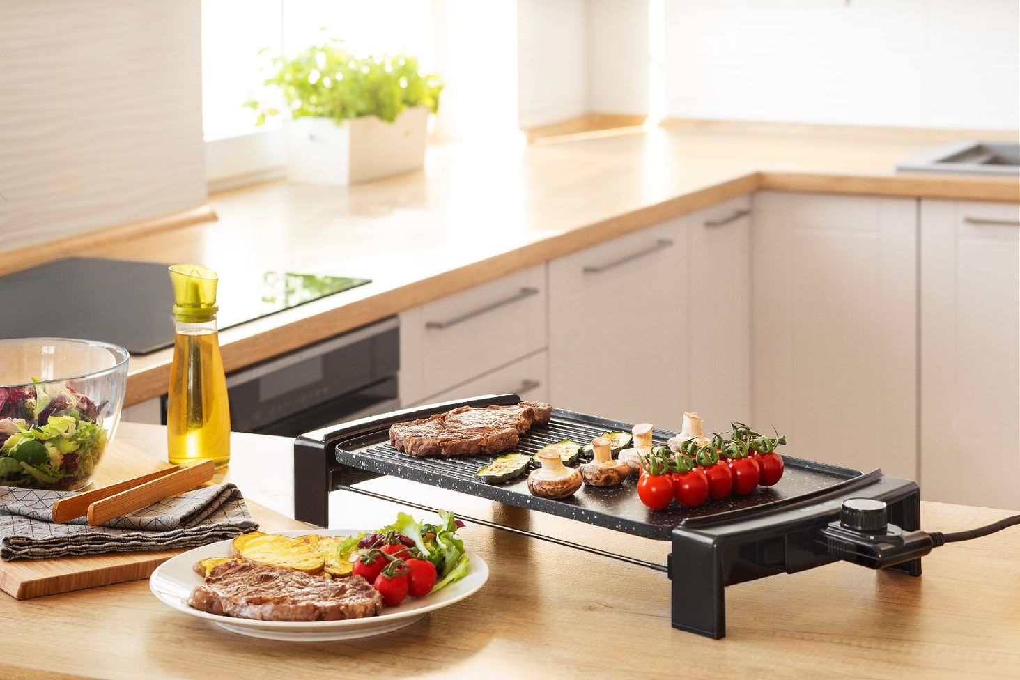 Комбінована плоска та ребриста пластина гриля 2 в 1. Контроль температури. Легке очищення та подвійна стійка гранітна поверхня
