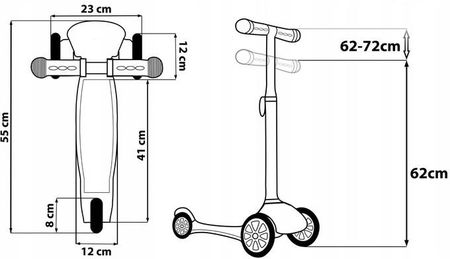 Самокат має просту систему складання. Максимальна вага користувача: 20 кг Розміри платформи: 41 (довжина платформи + заднє колесо) х 12 см Діаметр колеса: 8 см Висота регульованого керма від землі: 62 - 72 см Довжина всього самоката: 55 см