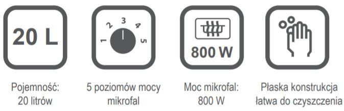Ємність: 20 літрівТип: мікрохвильова пічМеханічне керування5 рівнів мікрохвильової потужностіПростий дизайн, який легко чистити