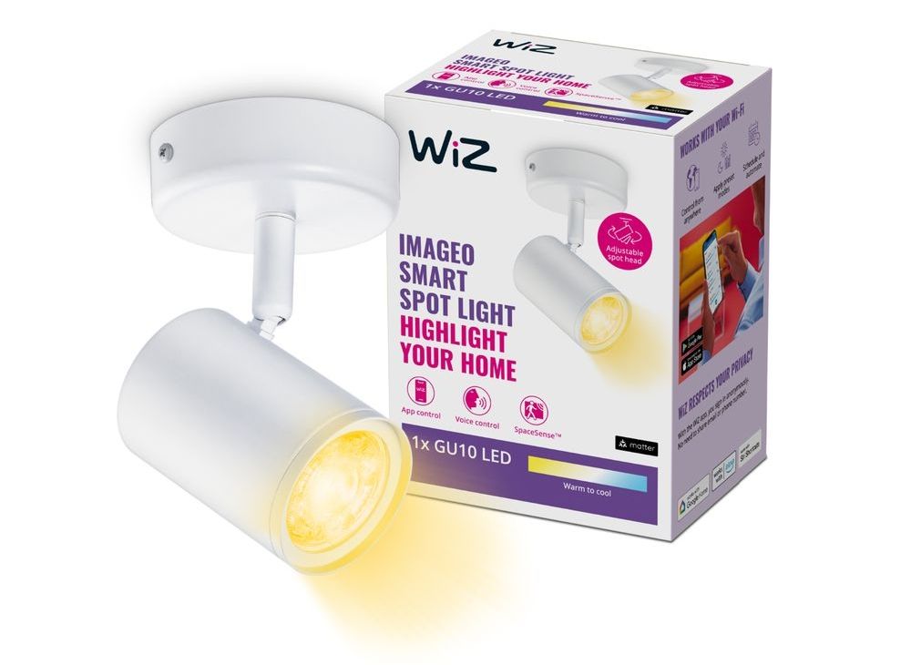Інтелектуальний вбудований прожектор WiZ Imageo, укладений в елегантну та сучасну білу рамку, світить одним регульованим пучком світла з температурою теплого або холодного білого кольору. Ви можете керувати ним за допомогою програми WiZ або голосом через існуючу мережу Wi-Fi.
