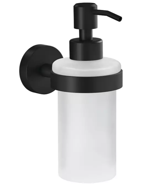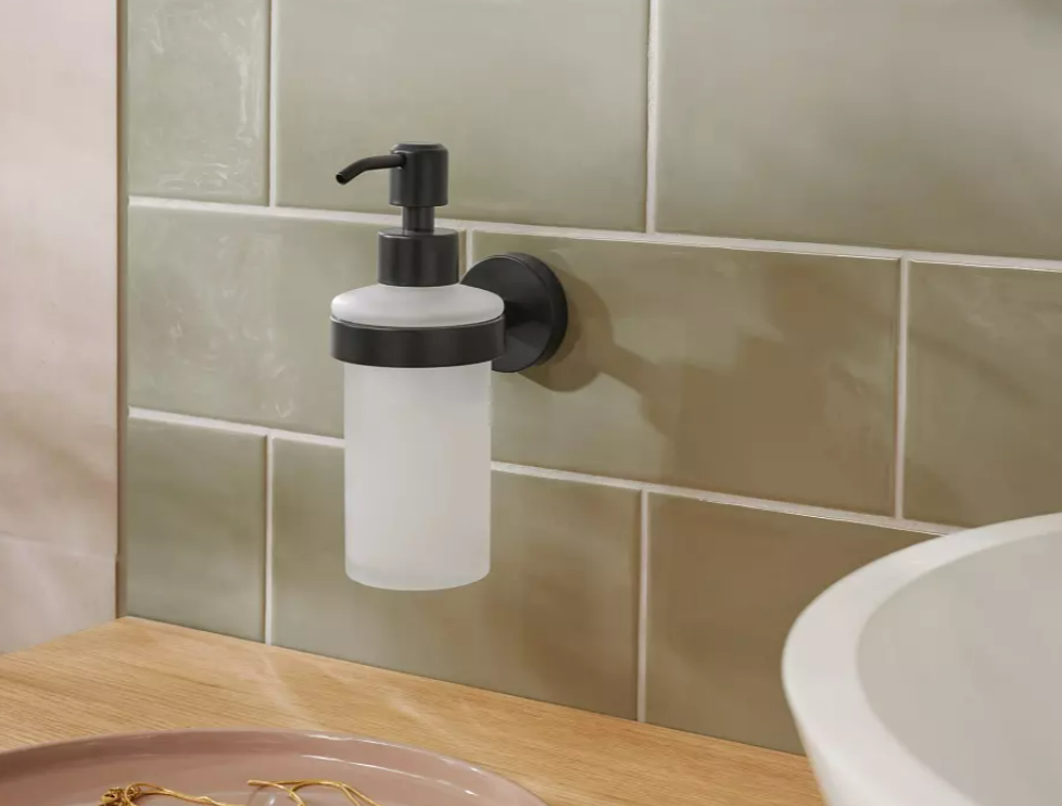 Настінне кріплення з порошковим покриттям у чорному матовому кольорі зі скляним дозатором рідкого мила є водночас гігієнічним і привабливим