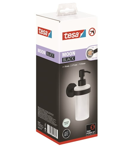 Дозатор для рідкого мила з технологією tesa® Power.Kit (самоклеючий монтажний розчин без свердління) Плавний заокруглений дизайн, матове чорне покриття – метал з порошковим покриттям і сатинований скляний контейнер Ідеальне доповнення до ванних кімнат у промисловому або скандинавському стилі Підходить для кріплення на підлозі з плитки , метал, натуральний камінь, мармур, бетон, дерево, скло та багато різних пластмас. Не підходить для монтажу на шпалерах, штукатурці, пластиках, таких як PP, PE, PTFE та інших антипригарних поверхнях