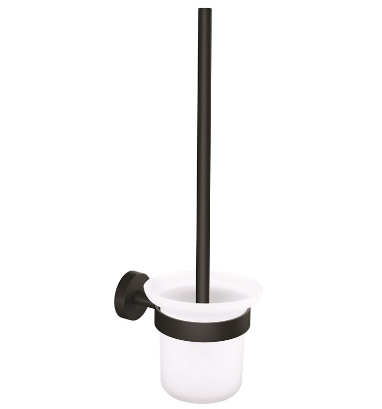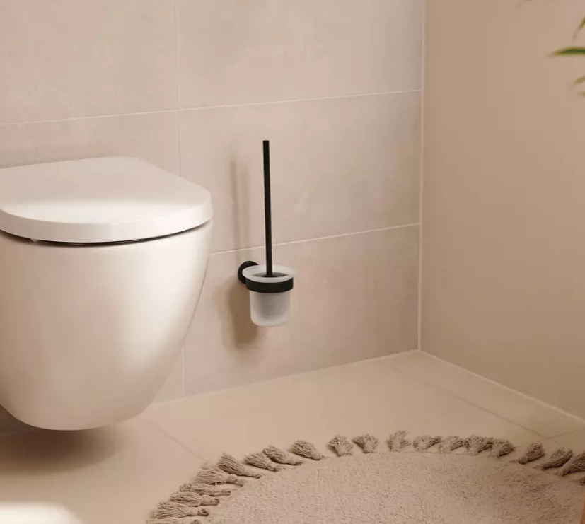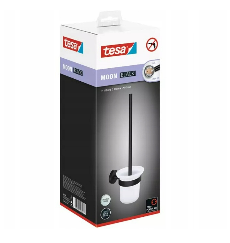 Щітка для чищення унітазу з утримувачем, прикріпленим за технологією tesa® Power.Kit (самоклеючий монтажний розчин без свердління) Плавний округлий дизайн, матове чорне покриття – металевий контейнер із порошковим покриттям і сатинований скляний контейнерДуже гігієнічний завдяки легкому зніманню чистий контейнер зі скла та знімна щітка. Ідеальне доповнення до ванних кімнат у промисловому чи скандинавському стилі. Підходить для монтажу на поверхнях із плитки, металу, натурального каменю, мармуру, бетону, дерева, скла та багатьох різних видів пластику