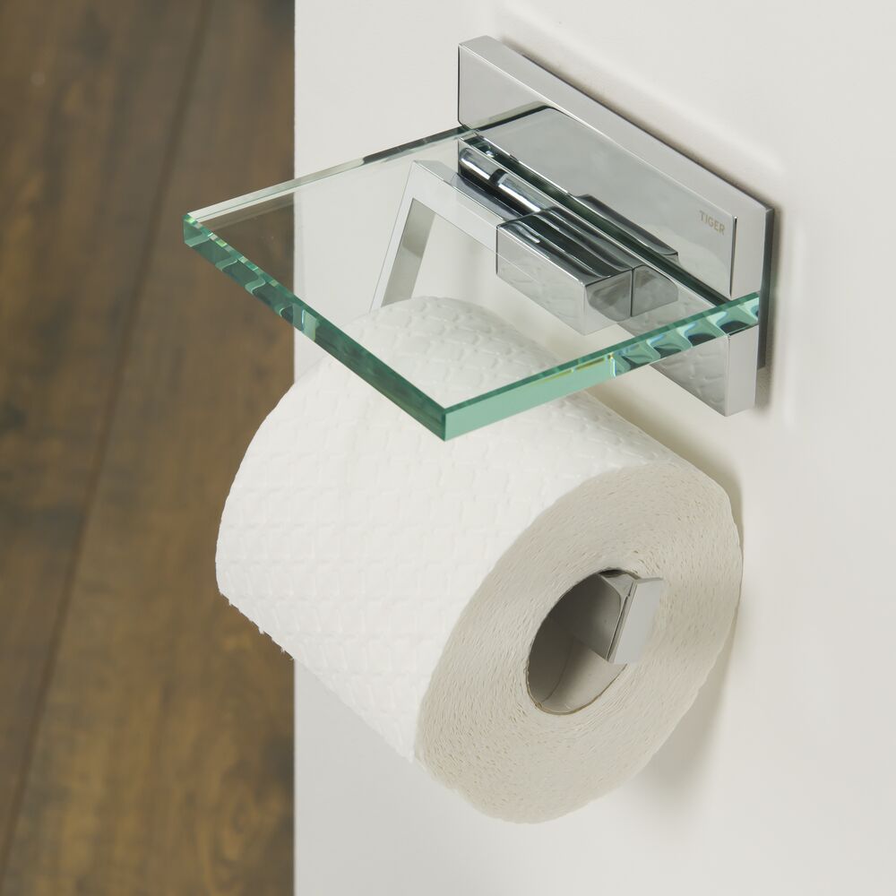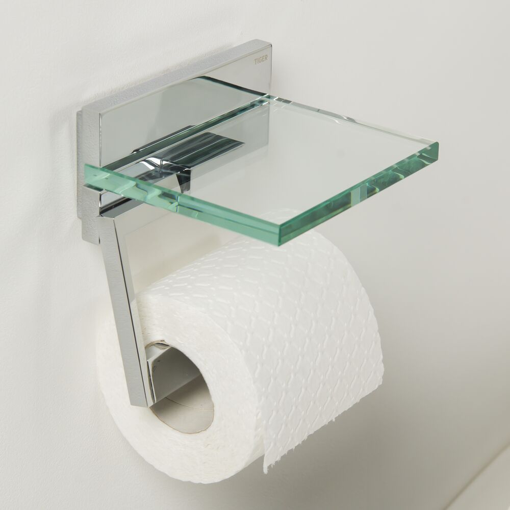 Цей тримач паперу Tiger Safira має хромований тримач для рулону, настінне кріплення та красиву прозору скляну полицю. Тримач можна легко прикріпити в будь-якому місці стіни, тому папір завжди буде під рукою. Приховані елементи кріплення гарантують елегантний вигляд.