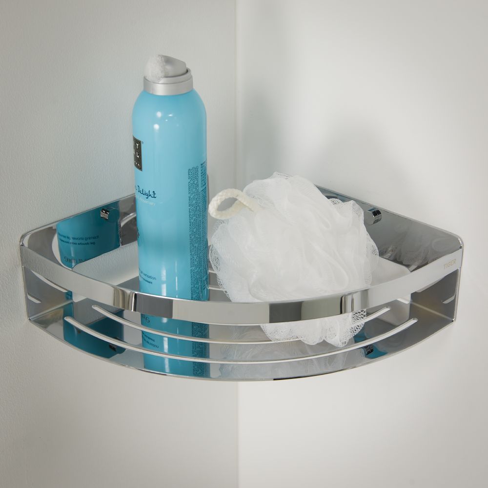 Велика кутова душова корзина Tiger Caddy з привабливим хромованим покриттям гарантує, що всі шампуні, кондиціонери та гелі для душу тепер будуть у вас під рукою. Плоске дно та високі стінки гарантують надійне зберігання косметики в кошику. Ви можете легко встановити цей кошик у будь-якому місці на стіні (кріпильні елементи входять у комплект), щоб ваша косметика завжди була під рукою. Цей душовий кошик, призначений для встановлення в кутку, чудово заощадить простір.