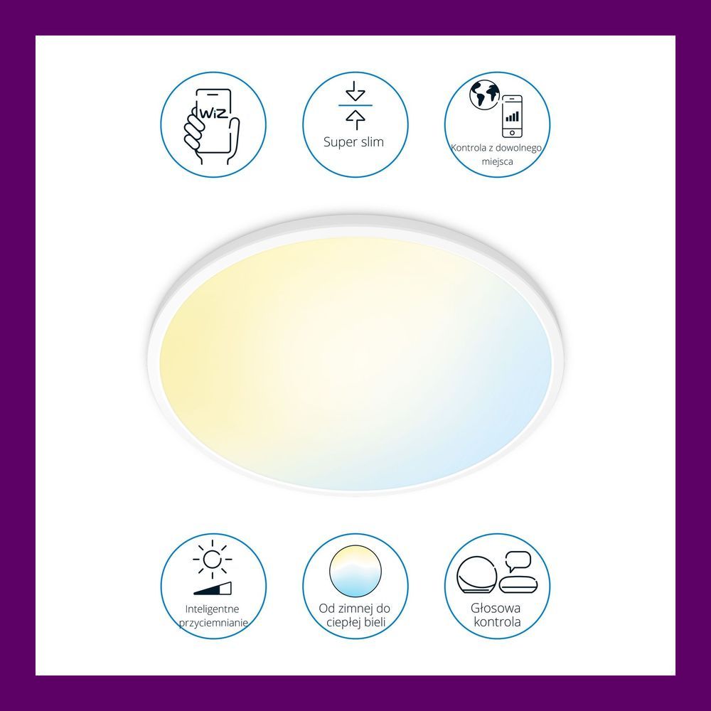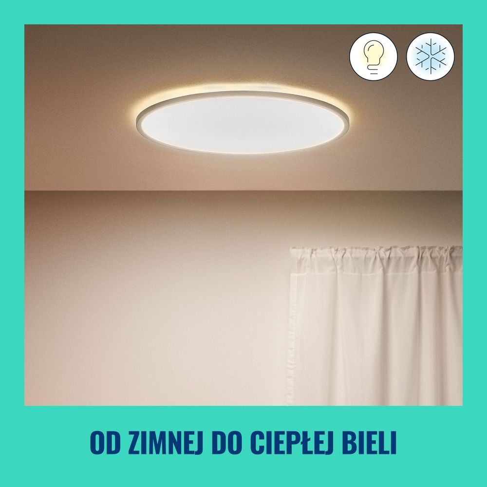 WiZ Super Slim забезпечує світло, адаптоване до ваших щоденних потреб. Велика кругла світлова поверхня наповнює кімнату прохолодним синім світлом, щоб покращити пильність і концентрацію, і затемнюється до м’якого теплого кольору, щоб допомогти вам розслабитися.