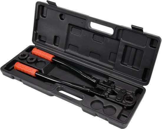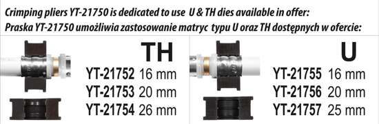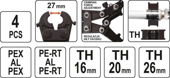 розбір губок: 27 мм Компактні розміри полегшують роботу Загальна довжина: 52,5 см Зручна, профільована рукоятка Можливість використання матриць типу TH і U Комплект включає найпопулярніші розміри конекторів TH: 16, 20 і 26 мм