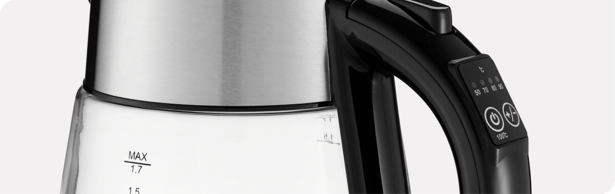 Індикатор рівня води: двосторонній Потужність: 1850-2200 Ємність: 1,7 Матеріал: скло/нержавіюча сталь Нагрівальний елемент: плоский/прихований Колір: нержавіюча сталь