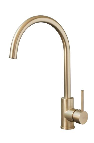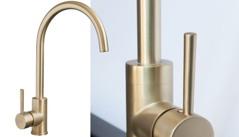 Змішувач GOLD в модному світло-золотистому кольорі ідеально поєднується з чорними раковинами, відповідно до сучасних тенденцій поєднання чорного і золотого на кухні.